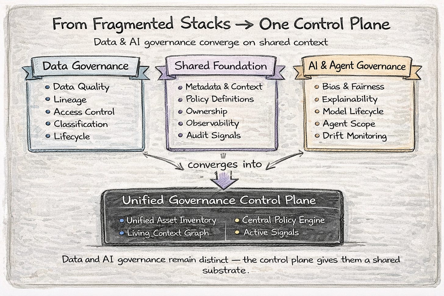 The “data governance vs AI governance” framing is a false battle. The foundations are the same, but the risk surface has expanded, especially into agents and autonomous action. The sustainable response is not a new silo. It is to extend and converge existing governance into one active control plane that governs how information and intelligence are used end to end.