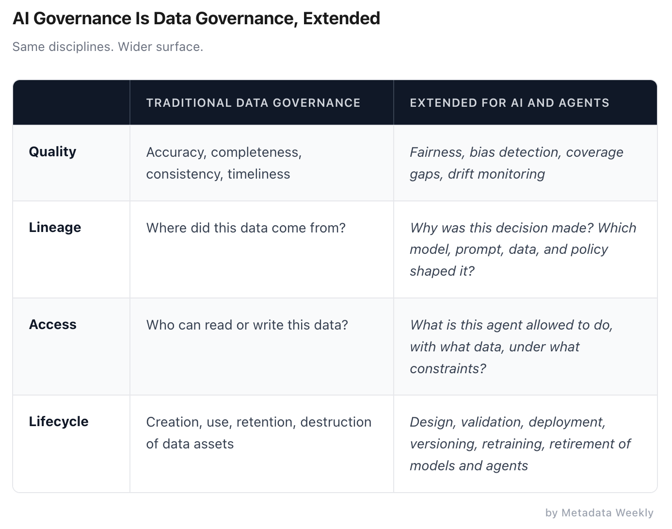 The table makes a simple point: every row is the same governance discipline, pointed at a wider surface. Data governance teams are already equipped for the left column. The right column is where they need to be invited into the AI loop.