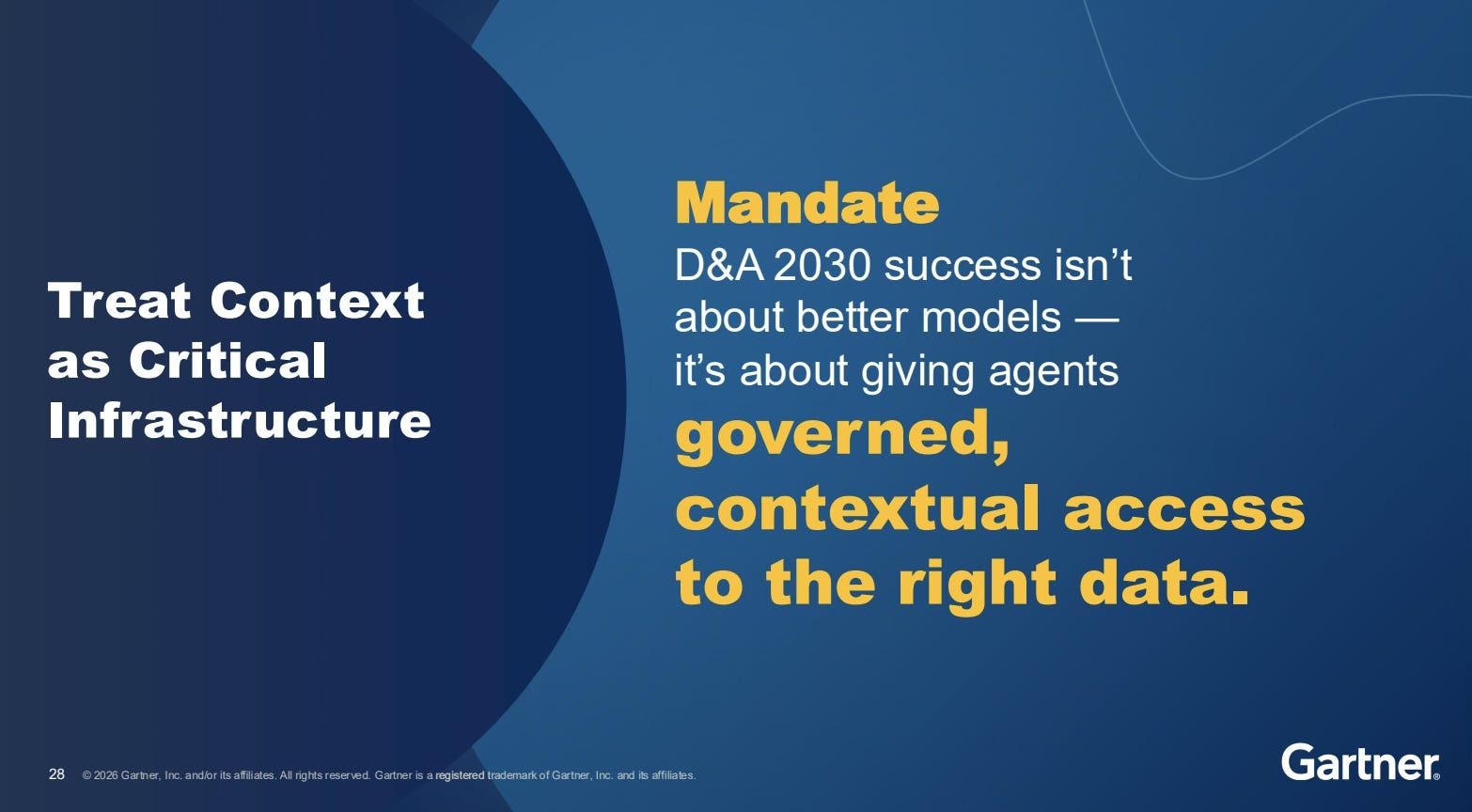 Rita Sallam, Distinguished VP Analyst, raised the stakes in her Signature Series session. Only one in five AI investments currently show measurable ROI. Her prescription: treat context as critical infrastructure, the same way organizations treat cybersecurity. That comparison is deliberate. When something gets the cybersecurity treatment, it moves from a technical conversation to a board conversation. It gets executive attention, dedicated budget, and organizational accountability. Rita called context “the brain for AI ,” arguing that agents cannot function autonomously without high-quality context and trust. She declared universal semantic layers a “non-negotiable foundation” and predicted they will be treated as critical infrastructure by 2030, alongside data platforms and cybersecurity.