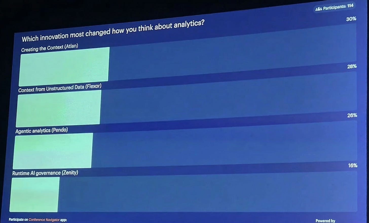 “Context layer” showed up back-to-back on the two biggest stages at the summit: the Opening Keynote and Rita Sallam’s Signature Series. Analysts used the phrase with conviction. Attendees photographed the slides. And when Gartner put four data innovations in front of 114 attendees and asked which one most changed how they think about analytics, a context graph won. Not an analyst picking a winner. Practitioners voting with their hands.