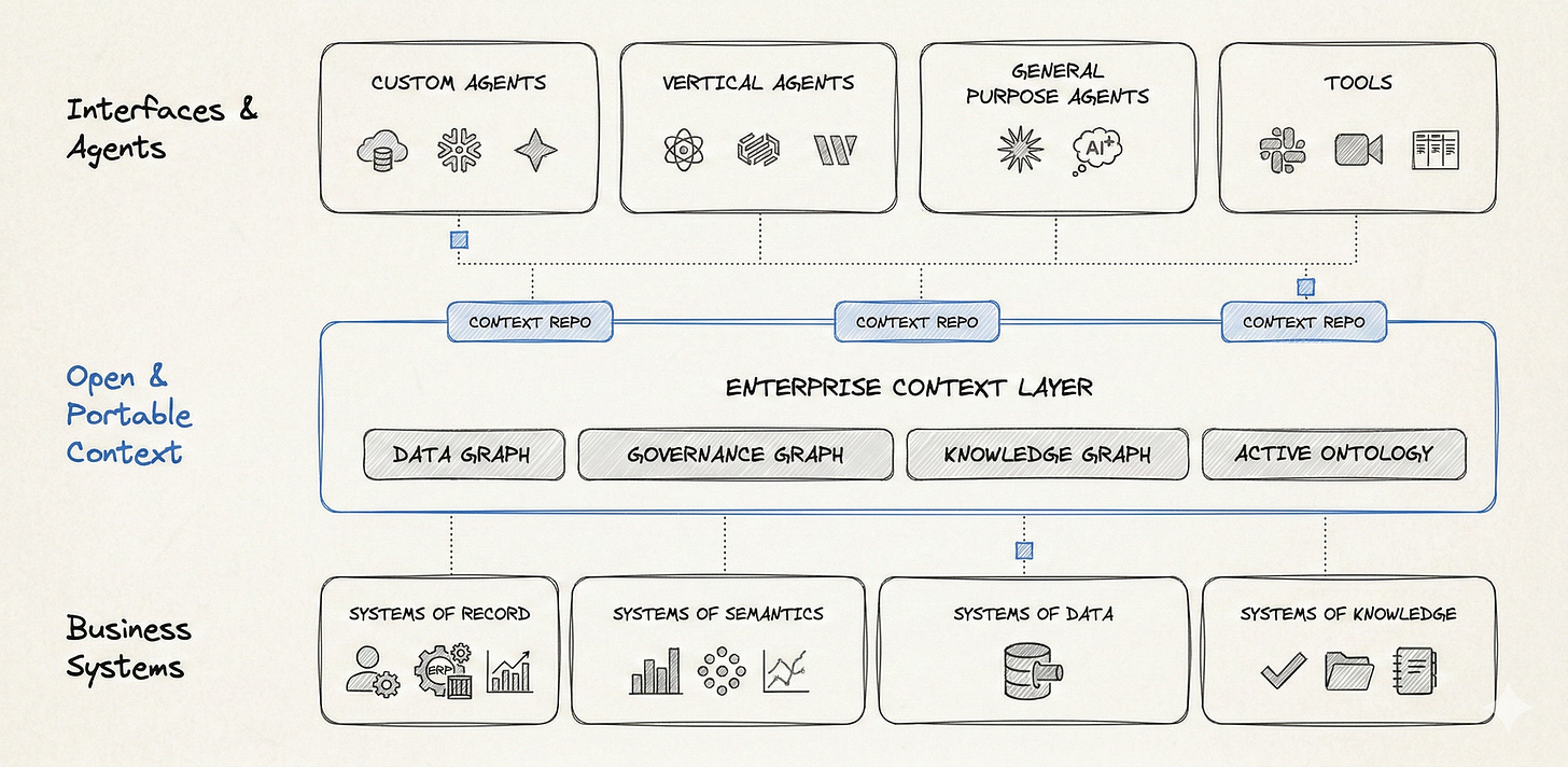 If every platform builds its own business context layer — as is happening now with Frontier’s semantic store, Snowflake’s Cortex, Databricks’ Genie, proprietary ontologies in BI tools, and embedded context in vertical SaaS — you don’t get a context layer. You get dozens of conflicting context silos.