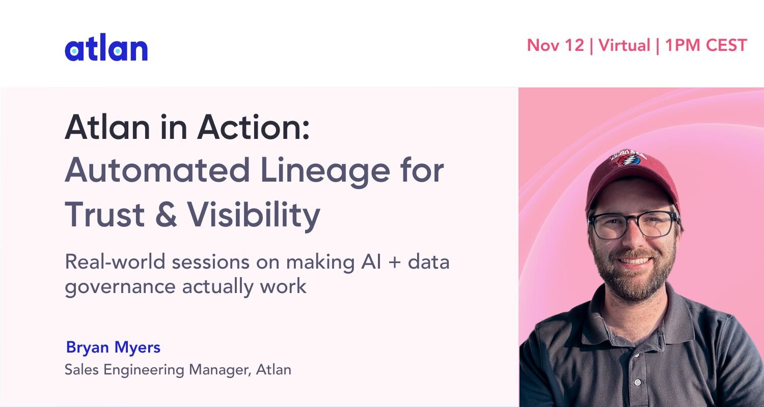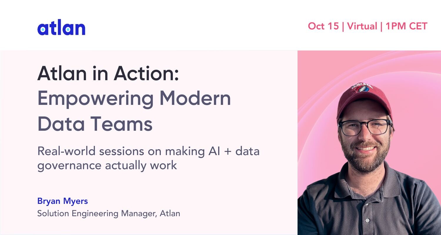 Introducing Atlan in Action, a 45-minute live demo with Bryan Myers, Solution Engineering Manager at Atlan walks through real-world examples of how teams use Atlan’s active metadata to discover trusted data, accelerate AI, and set guardrails — followed by a live Q&A on your toughest governance challenges.